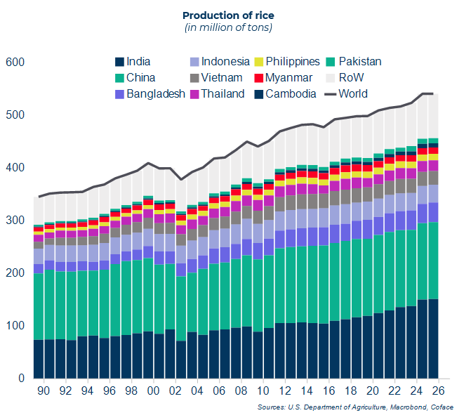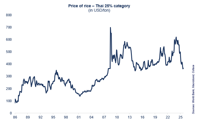 Since 2022, India, the world's leading exporter, had restricted its export sales to contain the surge in world prices (19% increase in 2022 and 2023) linked in particular to the war in Ukraine and poor weather conditions in Asia. The reopening of exports in 2024, coupled with record Asian harvests, led to a 35% drop in prices in one year. Given the upward production forecasts for 2026 and the potential return of La Niña in the fourth quarter of 2025, we anticipate a growing supply surplus in 2026. Prices are expected to continue falling at least until the end of 2025, with likely stabilization in 2026 at levels not seen in 10 years.